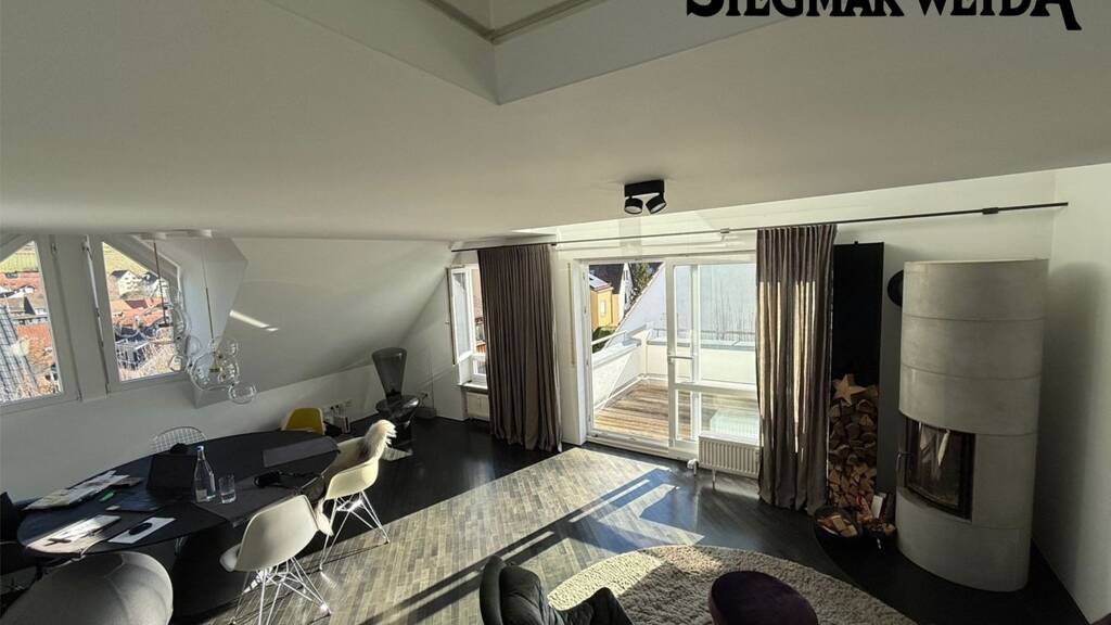 Der lichtdurchflutete große Wohnbereich mit offenem Kamin bildet das Herzstück der Wohnung und schafft eine stilvolle Atmosphäre mit besonderem Charm. Von hieraus sowie von einem weiteren Wohnbereich gelangen Sie auf zwei Balkone, die eine wunderschöne und unverbaubare Aussicht eröffnen - ein Ort für entspannte Stunden über den Dächern der Umgebung.