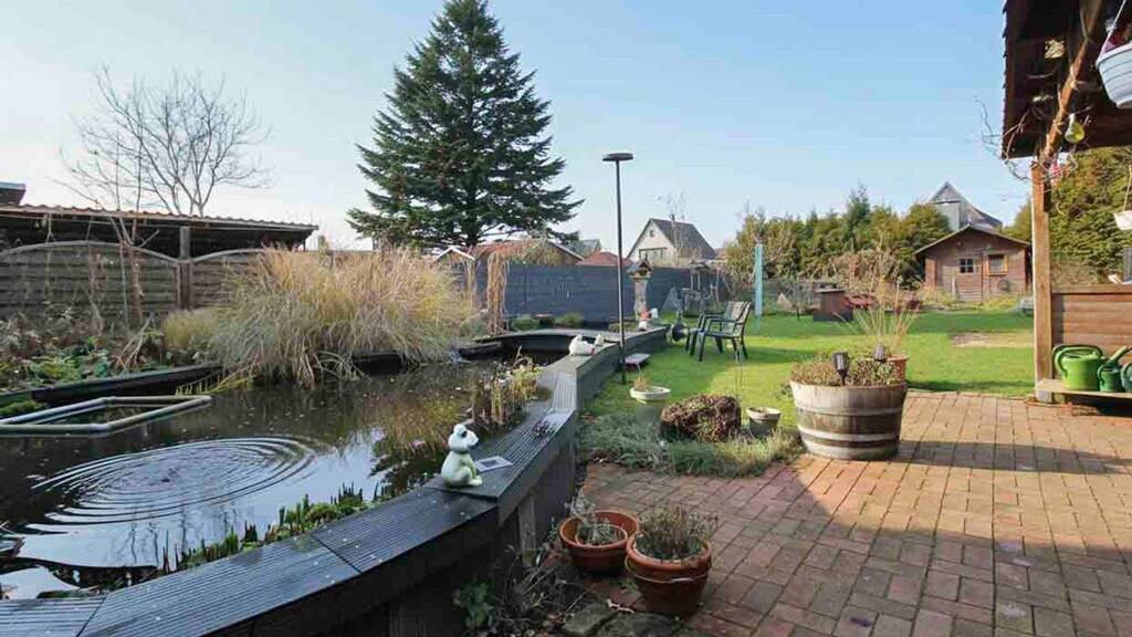 Das ca. 890 m² große Grundstück bietet viel Raum für Erholung im Freien. Der Garten mit Teich ist übersichtlich angelegt und lädt zu entspannten Stunden, Spiel und geselligem Beisammensein ein - bei gleichzeitig überschaubarem Pflegeaufwand.