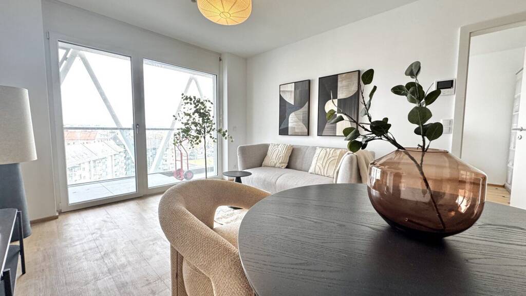 Mit barrierefreien Zugängen, einer hauseigenen Tiefgarage, begrünten Innenhof und intelligenten Lösungen für zeitgemäßes Wohnen. Die großzügigen Fensterfronten eröffnen einen atemberaubenden Blick über die Stadt.