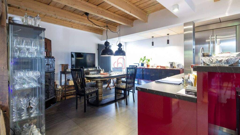 Das Erdgeschoß verfügt über ein Esszimmer mit offener Küche. Die Küche ist in hochwertigster Qualität und nach Maß gefertigt. Ein Küchentresen, eine große Arbeitsplatte und ein versteckter Küchenschrank für Gewürze und Co. zeigen, wie durchdacht die Lösung ist. Alle elektrischen Geräte und ein großer Kühlschrank sind selbstverständlich enthalten.