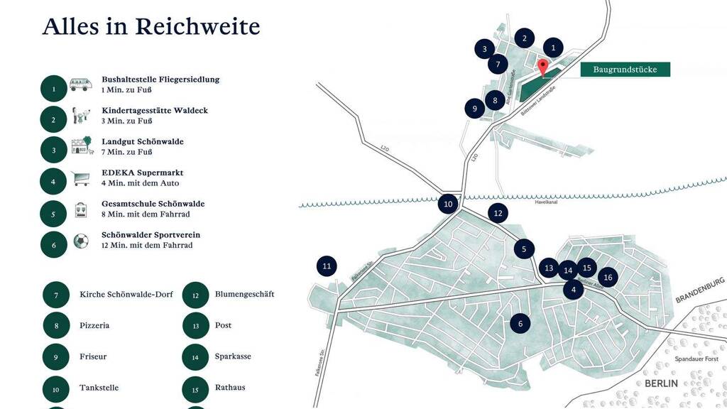 5 Minuten Fahrzeit von der westlichen Stadtgrenze Berlins (Spandau) im schönen Havelland Gemeinde Schönwalde Ortsteil Schönwalde-Dorf Anbindungen - nach Berlin mit Bus und Bahn - Regionalbahn ab Falkensee und Spandau - an den nördlichen und westlichen Berliner Ring - über Hennigsdorf an die A 111 - an das Autobahnkreuz Oranienburg Alles was Familien benötigen, finden Sie hier: - Einkaufsmöglichkeiten, Ärzte - KITA´s (auch fußläufig) - Grundschule mit Schulhort in Schönwalde-Siedlung - weiterführende Schule in Falkensee (Bus) - Gymnasium Falkensee, Velten - über 70 Vereine in der Gemeinde - Pferdehöfe, Wälder und Seen