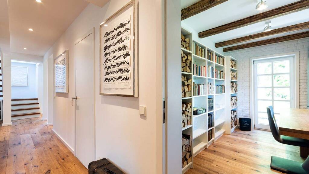 Im Erdgeschoss erwartet Sie ein Garderobenbereich mit Einbauten, ein Arbeitszimmer sowie ein modernes Gäste-WC mit Zugang zum Technikraum. Der lichtdurchflutete Wohn- und Essbereich mit Kamin, Barzimmer und bodentiefer Glasfront bildet das stilvolle Zentrum. Die offene BULTHAUP B1 Küche führt direkt auf die ca. 70?m² große Terrasse und in den parkähnlichen Garten. Über eine elegante Eichenholztreppe gelangen Sie ins Dachgeschoss mit luxuriösem Masterbereich, Einbauschränken, abtrennbarem Schlafbereich und exklusivem Bad mit freistehender Wanne, ebenerdiger Dusche, Corso-Sauna und Blick ins Grüne.