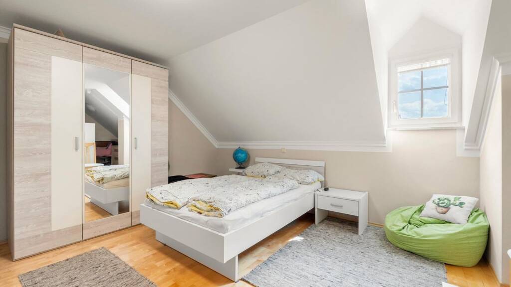 Die Wohnfläche beträgt rund 190 m² und bietet damit viel Platz zum Leben. Das Haus ist vollständig unterkellert und verfügt sowohl im Erdgeschoss als auch im Dachgeschoss über flexibel nutzbare Räume. Das Dachgeschoss lässt sich als eigene Wohnung nutzen, da es über eine eigene Küche mit Essecke, ein Bad und ein WC verfügt - die ursprüngliche Loggia wurde dabei zu zusätzlichem Wohnraum umgebaut. Im Erdgeschoss erwartet Sie eine hochwertige Küche, elegante Parkett- und Korkböden sowie Kunststofffenster mit Rollläden. Zwei großzügige, sonnige Südwest-Terrassen mit Glasüberdachung laden zum Entspannen und Genießen ein.