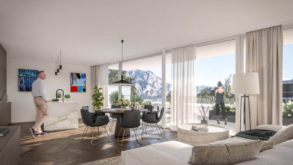 Größer denken. Das beginnt in den Schlosspark-Residenzen auf den großzügigen Balkonen und Terrassen, die einen einzigartigen Blick auf die Bergwelt um den Traunsee und ins Grüne bieten. Und das alles mitten im Zentrum und trotzdem in ruhiger Lage. Der richtige Ort, um sich ein gemütliches Gläschen zu gönnen und sich den nächsten Tag in der Traumwohnung auszumalen!