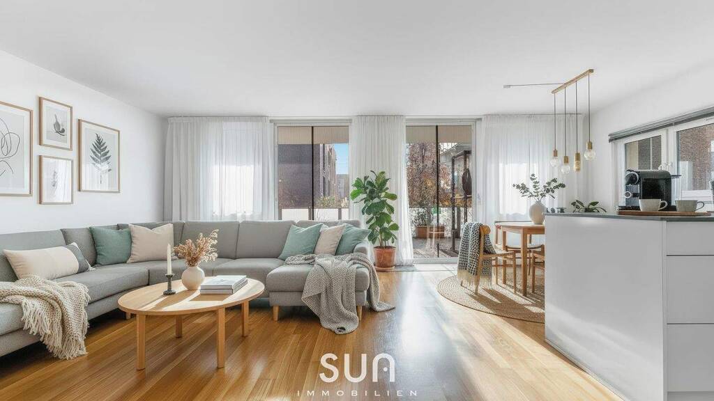 Schon beim Eintreten wird spürbar, wie durchdacht und hochwertig diese Wohnung gestaltet wurde. Die großzügige Diele öffnet sich zu einem Wohnkonzept, das viel Licht, klare Linien und ein harmonisches Raumgefühl vereint. Der elegante, großformatige Fliesenboden zieht sich durch die gesamte Wohnung und vermittelt eine moderne, zeitlose Ästhetik - zugleich pflegeleicht und stilvoll.