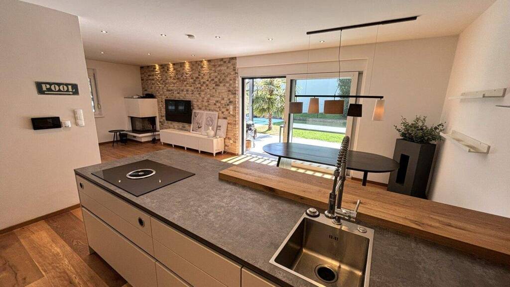 -vom Wohnessbereich aus gelangt man auf die erst 2024 erneuerte Terrasse mit hochwertigem Feinsteinzeug plus ca. 200 m2 Eigengarten und eigenem Swimmingpool