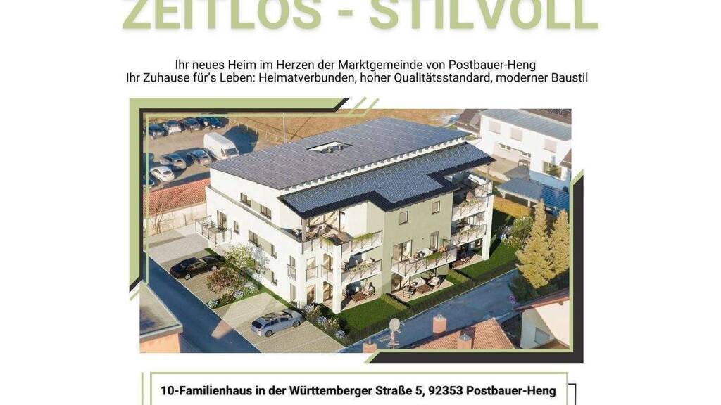 Im Zentrum von Postbauer-Heng entsteht hier auf einem 988m² großen Grundstück ein barrierefreies 10-Familienhaus mit zum Teil überdachten Außenstellplätzen in umwelfreundlicher KfW 40 QNG- Bauweise mit attraktiven Förder-Konditionen (zinsgünstiges Darlehen bis zu 150.000,-€, steuerlicher Vorteil durch Abschreibung von 5% der Anschaffungs- oder Herstellungskosten für 4 Jahre und zusätzlich 5% degressive Abschreibung bei Vermietung).