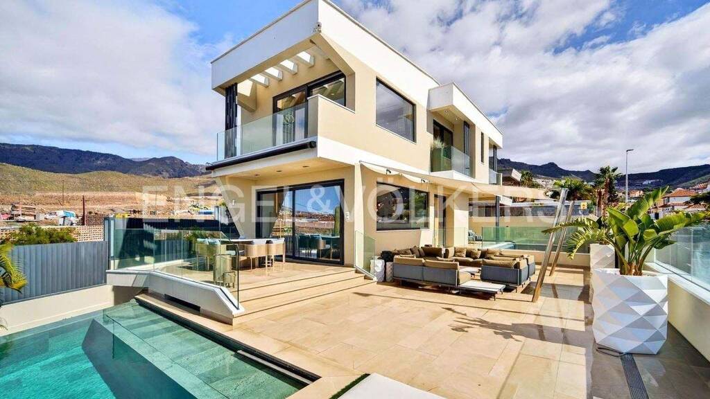 In einer der etabliertesten Wohngegenden im Süden Teneriffas gelegen, vereint diese 2022 erbaute Villa mit zeitgenössischer Architektur modernes Design, Funktionalität und hohe Bauqualität. Die Immobilie erstreckt sich über drei Ebenen. Das Hauptgeschoss bietet einen großzügigen, offenen Wohn- und Essbereich mit integrierter Küche, Kochinsel und hochwertigen Elektrogeräten. Große Fensterfronten sorgen für hervorragende Lichtverhältnisse und ermöglichen einen direkten Zugang zur überdachten Terrasse sowie zum Außenbereich mit privatem Pool, Wasserfall und Relaxzonen. Im Obergeschoss befinden sich drei Schlafzimmer, jeweils mit Ankleidebereich, en-suite Badezimmer und privater Terrasse. Die Räume wurden so konzipiert, dass sie Privatsphäre und Komfort gewährleisten und gleichzeitig offene Ausblicke sowie eine optimale Ausrichtung bieten. Großformatige Feinsteinzeugböden prägen die Gemeinschaftsbereiche, während die Schlafzimmer mit Holzoptik-Oberflächen ausgestattet sind. Aluminiumfenster mit Doppelverglasung sowie weiße Innenschreinerei unterstreichen die moderne Ästhetik und Energieeffizienz. Das Untergeschoss erweitert die Nutzungsmöglichkeiten der Immobilie und bietet eine private Garage für zwei Fahrzeuge, großzügige Abstellflächen sowie einen multifunktionalen Raum mit eigenem Badezimmer, der sich ideal als Fitnessraum, Büro oder Gästebereich eignet. Ergänzend steht ein speziell konzipierter Weinkeller zur Verfügung, der einen besonderen Mehrwert für die Immobilie darstellt. Die Immobilie wird vollständig ausgestattet übergeben und verfügt über Klimaanlage in allen Räumen, LED-Beleuchtung, Solarpaneele sowie ein automatisches Bewässerungssystem im Garten.
