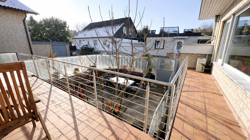 Die sicht- und windgeschützte Terrasse lädt an warmen Tagen zum Entspannen, Feiern oder auch zu entspannten Kundengesprächen im Freien ein. Der über Eck verlaufende Sonnenbalkon, direkt vom Wohnzimmer zugänglich, erweitert den Wohnraum nach draußen und bietet zusätzliche Rückzugsorte mit Privatsphäre.