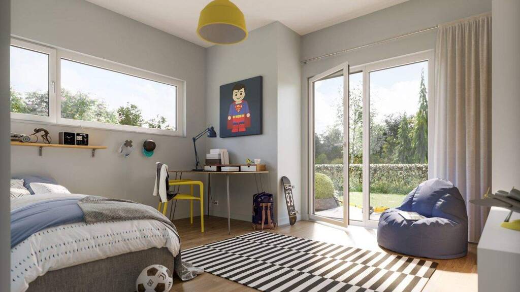 Dieser moderne Bungalow erfüllt einer Familie mit 2 Kindern alle Wünsche von einem pflegeleichten und modernen Zuhause auf einer Ebene! Genial ist der Bungalow auch als Altersruhesitz. Schon beim Betreten des Hauses fallen die Offenheit und Helligkeit des Wohnens auf. Geniessen Sie die Vorteile des großen Koch-, Wohn- und Eßbereiches mit Ausgang zur sonnigen Terrasse. Neben einem behaglichen Schlafzimmer für die Eltern gibt es zwei geräumige Kinderzimmer und ein schickes Badezimmer. Wunderschön der "nahtlose" Übergang auf Ihre Terrasse und in den Garten. Natürlich können Sie den Grundriß auch nach Ihren persönlichen Wünschen gestalten.