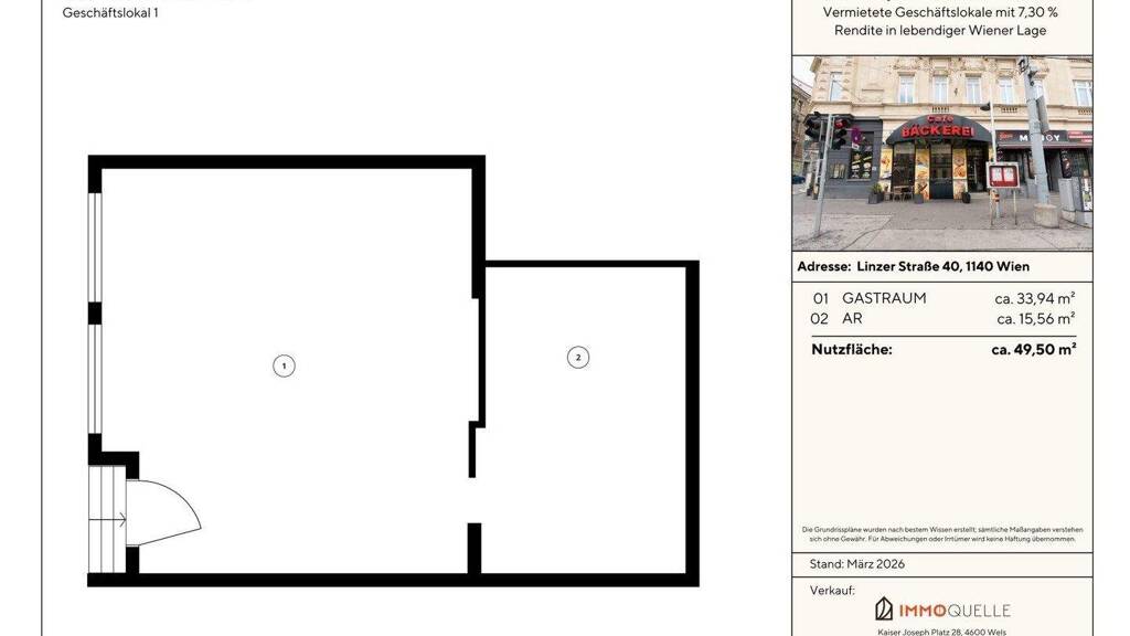 Das Geschäftslokal 1 ist aktuell bis zum Jahr 2033 an eine Bäckerei vermietet, während das zweite Geschäftslokal unbefristet vermietet ist. Dadurch ergibt sich für Käufer eine stabile und planbare Einnahmesituation. Gemeinsam erwirtschaften die beiden Geschäftslokale eine jährliche Rendite von rund 7,30 % und stellen damit eine besonders attraktive Kapitalanlage in Wiener Frequenzlage dar - mit solider Ertragsbasis und langfristigem Wertpotenzial.