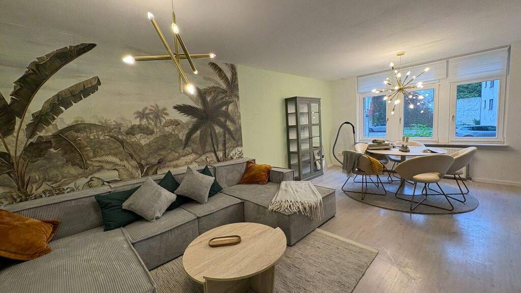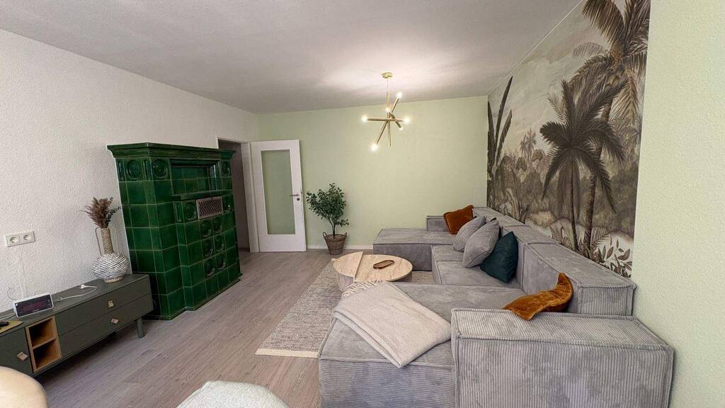 Helle Farben, klare Linien und liebevoll ausgewählte Details schaffen eine warme und wohnliche Atmosphäre. Das geschmackvoll gestaltete Wohnzimmer wird durch eine besondere Designer-Tapete zum echten Blickfang und lädt zum Entspannen und Wohlfühlen ein. Die Wohnung ist vollständig möbliert und hochwertig ausgestattet, ideal für alle, die sofort einziehen und sich zu Hause fühlen möchten. Die neue modere Einbauküche ist mit allen wichtigen Geräten ausgestattet. Das Badezimmer wurde kürzlich vollständig neu renoviert und präsentiert sich in zeitgemäßem, hochwertigem Design.