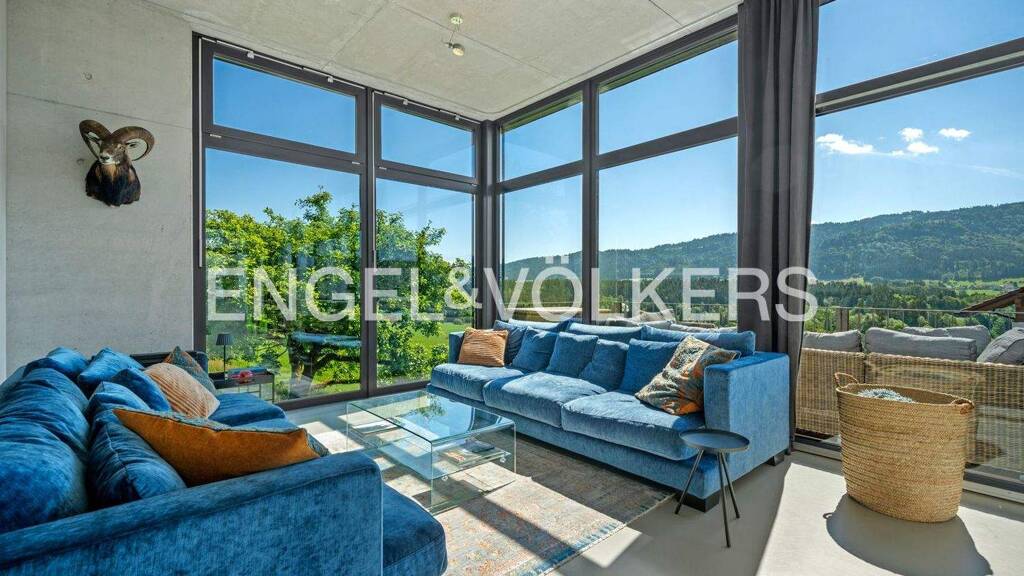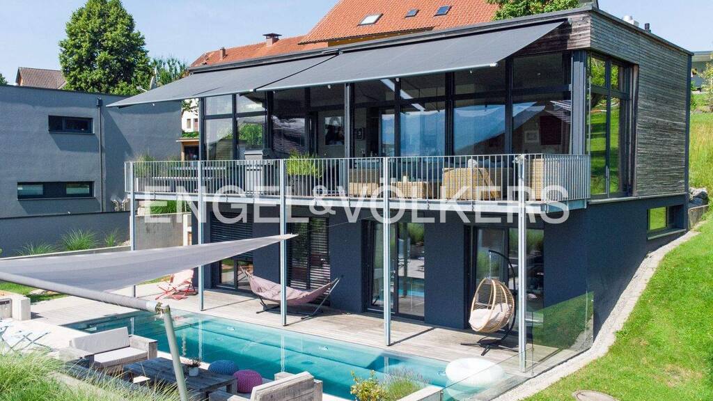 Mitten im Grünen, umgeben von malerischen Obstbäumen und eingebettet in eine idyllische Naturlandschaft, präsentiert sich dieses moderne Einfamilienhaus aus dem Jahr 2010 als wahres Wohnidyll. Die großzügige Wohnfläche von ca. 158 m² überzeugt durch eine durchdachte Raumaufteilung, helle, offene Wohnbereiche und eine Ausstattung auf hohem Niveau. Bereits im Erdgeschoss zeigt sich das Haus als ideales Zuhause für Familien: Vier lichtdurchflutete Schlafzimmer - alle mit direktem Zugang zur sonnigen Terrasse - bieten Rückzugsmöglichkeiten und höchsten Wohnkomfort. Das Hauptschlafzimmer verfügt über ein elegantes Bad en Suite sowie eine separate Ankleide. Ein weiteres voll ausgestattetes Badezimmer ergänzt das Raumangebot auf dieser Ebene. Ein besonderes Highlight ist die großzügige, mit Travertin ausgelegte Terrasse mit beheiztem Pool und integrierter Gegenstromanlage. Dank moderner Wärmepumpentechnologie, einer Photovoltaikanlage und Solar-Poolabdeckung ist ganzjähriges Badevergnügen möglich - energieeffizient und komfortabel zugleich. Im Obergeschoss begeistert der offene Wohn- und Essbereich durch seine lichtdurchflutete Architektur mit bodentiefen Fenstern und direktem Zugang zur großzügigen Terrasse mit edlem Bankiraiholzbelag. Elektrische Markisen mit integrierten Heizstrahlern und Lichtleisten schaffen eine stimmungsvolle Atmosphäre und verlängern die Outdoor-Saison bis weit in den Herbst. Die hochwertig ausgestattete Küche mit zentraler Kochinsel fügt sich harmonisch in den Wohnbereich ein und bildet das kommunikative Herzstück des Hauses. Ergänzt wird das Raumkonzept durch einen praktischen Hauswirtschaftsraum sowie einen großzügigen Abstellraum mit viel Stauraum. Hinter dem Haus lädt eine zweite, ebenfalls mit Travertinstein ausgelegte Terrasse zum Verweilen ein - besonders in den Morgenstunden oder an heißen Sommertagen ein idyllischer Ort im Schatten. Auch technisch erfüllt diese Immobilie höchste Ansprüche: Dreifach verglaste Fenster, elektrische Jalousien, maßgefertigte Schreiner-Einbauten, eine energieeffiziente Gasheizung in Kombination mit Fußbodenheizung sowie durchgehend robuste EPU-Böden unterstreichen die Qualität und den hohen Wohnstandard. Für Fahrzeuge stehen ein großzügiger Carport mit drei Stellplätzen sowie ein zusätzlicher Außenstellplatz zur Verfügung. Ein separater Fahrradraum bietet zudem sicheren Stauraum für Zweiräder und weiteres Equipment.