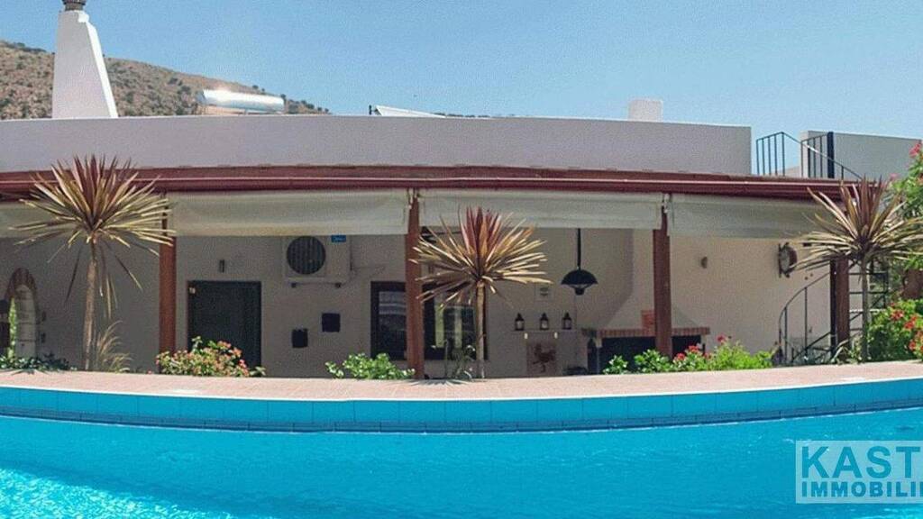 Der Außenbereich besteht aus: - Privater Parkplatz für mehrere Fahrzeuge - Solarbeheiztes Schwimmbad ca. 7×5 Meter mit 2-Meter-Rutsche - Pool ca. 2 m Tiefe im tiefen Ende, flaches Ende 1,2 m - Große Pergola als Schattenspender am Pool - 3/4 Terrassenbereiche im Freien. - Pergola, die die große Außenküche mit 2-Platten-Gasherd, eingebautem Grill und großem Brot-/Pizzaofen abdeckt - Außenjalousien für Wind/Regen/Sonne etc. - ferngesteuerter beleuchteter Deckenventilator und ferngesteuerte Außenwärmelampe - Garten bepflanzt mit vielen etablierten Bäumen, Blumen und Sträuchern - Gartenbewässerungssysteme installiert - Großes Gemüsebeet 2 Feigenbäume - 14 Olivenbäume, die in einem guten Jahr ca. 125 Liter Olivenöl liefern - Großer Lagerschuppen für Holz oder Gartengeräte - Pumpenraum für Schwimmbadfilter/Pumpen etc. -Hühnerstall geeignet für ca. 12 Hühner - Größtenteils möbliert und ist sofort bezugsfertig.