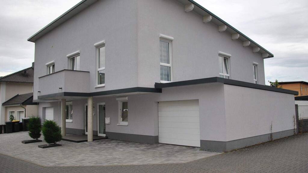 Zum Verkauf steht ein im Jahre 2012 in massiver Bauweise aus Bimsstein errichtetes Einfamilienhaus mit Einliegerwohnung und 2 Garagen. Das Gebäude besteht aus 2 Geschossen: Erdgeschoss und Obergeschoss; vor Wettereinflüssen wird das Ganze durch ein Pultdach geschützt. Im Erdgeschoss des Hauses befinden sich der Hausanschlussraum und die ca. 90 m² große Einliegerwohnung, die über einen eigenen Eingang verfügt. Die Einliegerwohnung besteht aus Küche, Abstellraum, Bad, WC, Wohnzimmer und ein Schlafzimmer. Aus dem Wohnzimmer gelangt man zum überdachten Freisitz und zum Garten; der Abstellraum verfügt über eine Verbindungstür zur Garage, sodass Einkäufer direkt aus der Garage in die Wohnung getragen werden können. Die Hauptwohnung mit ca. 177 m² befindet sich im Obergeschoss des Hauses und besteht aus geräumiger offener Wohnküche, einem Badezimmer sowie 3 Schlafzimmern. Zwei Schlafzimmer verfügen über eigene Umkleideräume, zwei Balkone stehen Ihnen hier zur Verfügung. In beiden Wohnungen sind jeweils ein Holzkamin vorhanden. Auf dem Grundstück befinden sich mehrere offene sowie überdachte Sitzgelegenheiten, sodass das Grillvergnügen bei beinahe jedem Wetter möglich ist.
