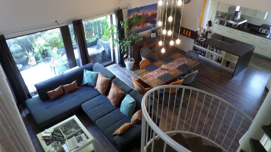 Das Herzstück des Hauses bildet der beeindruckende Wohnbereich mit doppelter Deckenhöhe und offener Küche. Diese besondere Architektur schafft ein offenes und lichtdurchflutetes Ambiente und vermittelt ein einzigartiges Gefühl von Freiheit und Weite. Eine imponierende Wendeltreppe verbindet den Wohnbereich mit der oberen Etage und der Galerie. Für Ihr Wohlbefinden und entspannte Stunden steht Ihnen eine Sauna zur Verfügung und im großzügigen Garten, der direkt an das Naherholungsgebiet anschließt, befindet sich ein beheizbarer Aufstellpool.