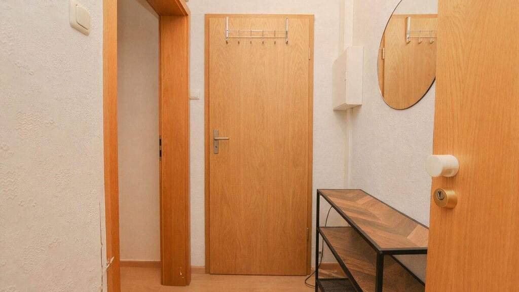 Über die Diele gelangen Sie in den Wohn- und Küchenbereich sowie in das Badezimmer der Wohnung. Durch den Küchenbereich gelangen Sie in das Schlafzimmer.