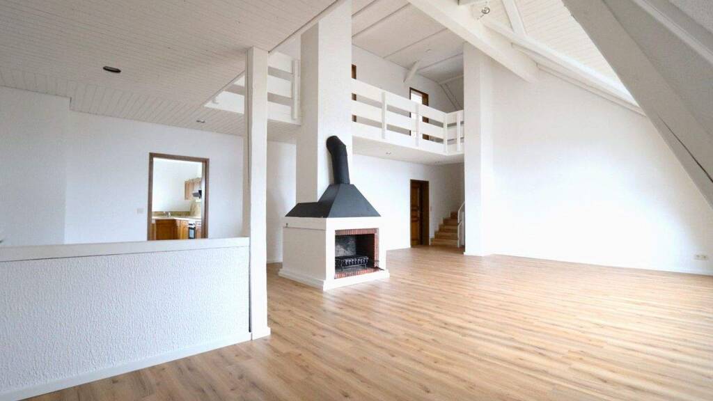 Aufgeteilt ist die Wohnung in einen Eingangsbereich mit direktem Zugang zum offen gestalteten und loftartigen Wohnbereich mit Zugang zur Küche. Ein dekorativer Kamin im Wohnzimmer verleiht dem Raum eine gemütliche Atmosphäre, während die großzügige Fensterfront für Helligkeit sorgt.