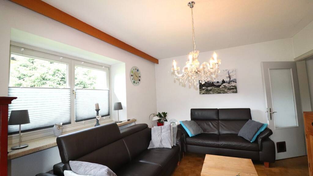 Wohnküche mit Sofa und Esstisch, ein Doppelschlafzimmer mit eigenem Bad, ein Doppelschlafzimmer mit Zugang zum Südbalkon, ein Schlafzimmer mit Doppelbett und Etagenbett. Vor dem Haus befinden sich ein Carport mit zwei Stellplätzen und ein Schuppen. Über ein Tor gelangt man in den hinteren Garten.