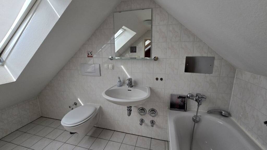 Zusätzlich gibt es im Spitzboden weitere Abstellflächen: zwei Räume sowie ein weiteres Bad mit Wanne. Durch die Schrägen (geringe Deckenhöhe) sind die Räume nur eingeschränkt nutzbar.