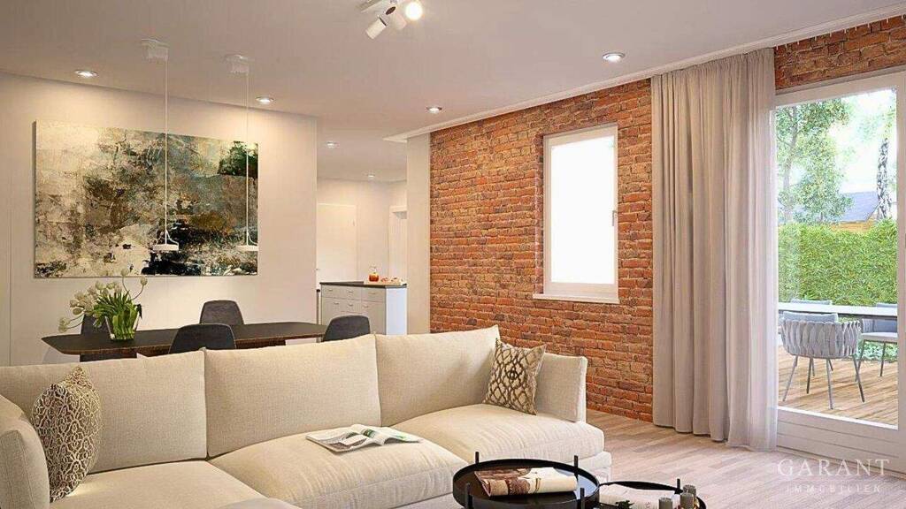 Die äußerst geschmackvoll eingesetzten Stilelemente, wie eine Klinkerwand in Kombination mit Designer Estrichböden, in minimalistischer Ästhetik, verleihen dieser eleganten Erdgeschosswohnung einen hochmodernen industriellen Charme.