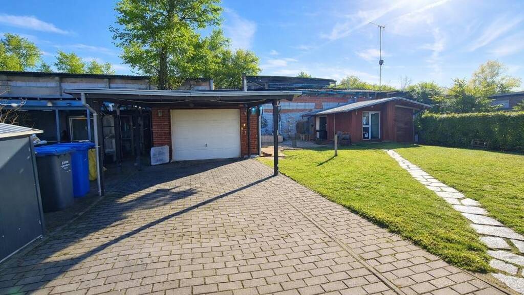 Das Grundstück überzeugt mit einer gepflasterten Zufahrt, Stellplätzen für mehrere Fahrzeuge, einem Holzhaus mit Duschbad, einer Garage mit zusätzlichem Gestaltungspotenzial.