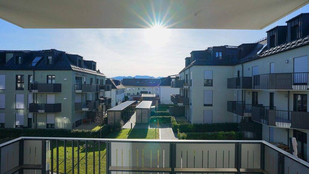 Der Wohnbereich erstreckt sich nach SĂĽden und wird mit dem Balkon ĂĽber eine groĂźe Fenster-/TĂĽrenfront vereint, von dem Sie einen unvergleichlichen Blick auf die beeindruckende Berglandschaft von Traunstein genieĂźen.