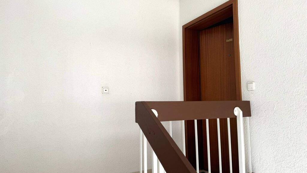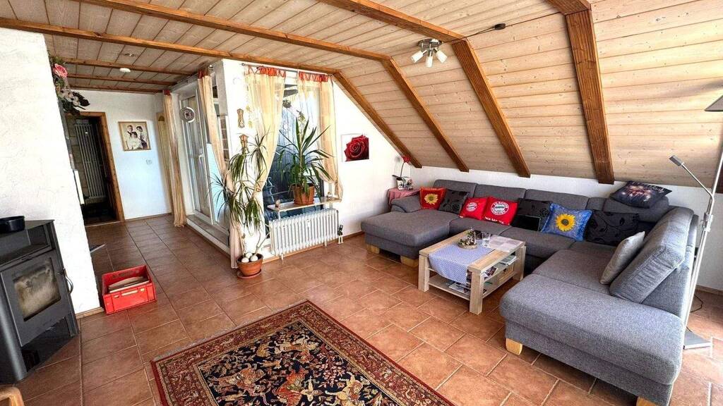 Der großzügige Flur führt in alle Räume. Das Wohnzimmer ist hell und bietet direkten Zugang zur Dachterrasse. Neben dem Schlafzimmer steht ein weiteres Zimmer zur Verfügung, das sich ideal als Kinder-, Arbeits- oder Gästezimmer eignet. Die Küche ist separat angelegt und verfügt über ein Fenster. Das Badezimmer ist mit einer Badewanne und Dusche ausgestattet. In der Wohnung gibt es einen Holzofen für gemütliche Winterabende. Der zur dazu gehörende Speicher ist von der Wohnung aus zugänglich.