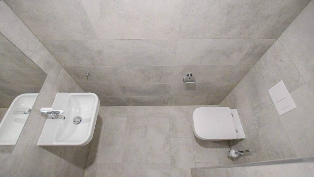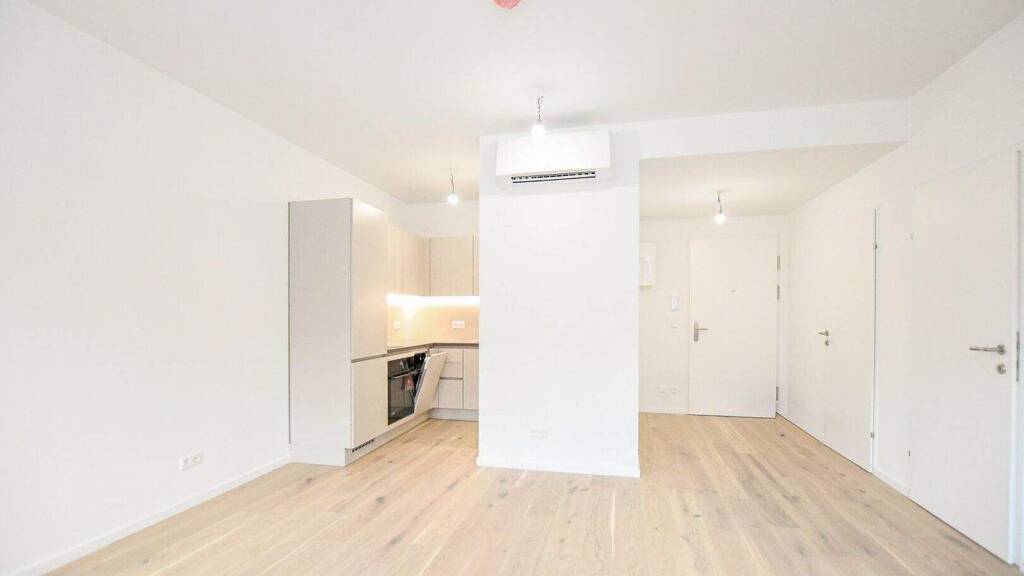 Der durchdachte Grundriss bietet einen kompakten Vorraum, ein modernes Badezimmer mit Dusche und Waschmaschinen-Anschluss, ein separates WC, ein Schlafzimmer sowie ein großes Wohnzimmer. Die getrennte Küche ist vollständig ausgestattet und verfügt noch über einen zusätzlichen Abstellraum. Außerdem gibt es eine Loggia, die in den Innenhof ausgerichtet ist.