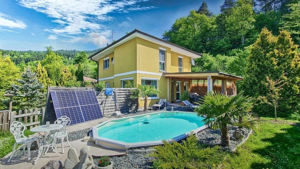 Das gut durchdachte Konzept des Hauses beginnt mit der Anordnung der hellen Räumlichkeiten und führt von der großen, überdachten Gartenterrasse, der Infrarotsauna im Untergeschoß zum effizienten Heizsystem. Die Heizung wurde perfekt auf die hervorragende Wärmedämmung abgestimmt, wodurch niedrige Energiekosten garantiert sind. Ein moderner Ofen mit Sichtfenster sorgt für wohlige Wärme speziell in kalten Wintertagen. Ein Highlight ist der einladende Pool, der Ihnen und Ihren Kindern im heißen Sommer die ersehnte Erfrischung bietet. Genießen Sie außerdem Ihre eigene Fass-Sauna, die für wohltuende Entspannung sorgt. Für Ihre Fahrzeuge steht ein praktisches Doppelcarport, sowie zwei Stellplätze zur Verfügung.