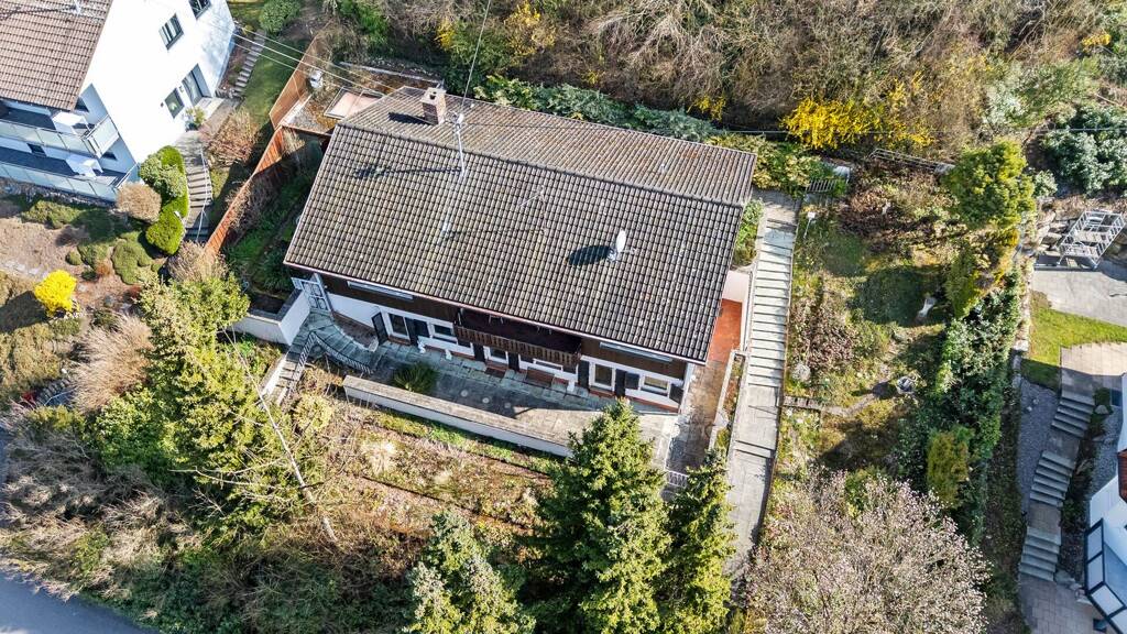 Das Grundstück ist durch die Hanglage in seiner Nutzung teilweise eingeschränkt, bietet jedoch interessante Perspektiven und eine besondere Wohnsituation mit separaten Zugängen und Terrassenflächen auf unterschiedlichen Ebenen.