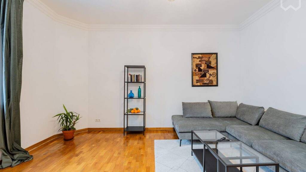 Die Wohnung hat schöne Massivholzparkettböden und hohe Decken mit originalen Stuckelementen und Rundbogenfenster. Das geräumige Wohnzimmer ist geschmackvoll und komfortabel eingerichtet, mit großem Smart-TV. Die gemütliche Küche ist voll ausgestattet mit Induktionskochfeld, Backofen, Kühlschrank, Waschmaschine, Geschirrspüler und Mikrowelle. Das moderne Badezimmer verfügt über eine Badewanne, eine separate begehbare Regendusche und einen Handtuchheizkörper.