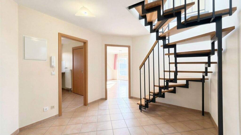 Bereits beim Betreten der Wohnung empfängt Sie ein einladender Eingangsbereich mit Platz für eine Garderobe sowie zusätzliche Staumöglichkeiten. Von hier aus erschließen sich die Räume der unteren Wohnebene auf übersichtliche und komfortable Weise. Der Mittelpunkt der unteren Ebene ist dabei das Wohn- und Esszimmer mit Zugang zum Balkon. Große Fensterflächen sorgen für viel Tageslicht und schaffen eine freundliche, warme Atmosphäre. Der großzügige Balkon lädt zu entspannten Stunden im Freien ein - sei es für ein Frühstück an der frischen Luft oder als Rückzugsort nach einem langen Arbeitstag. Angrenzend befindet sich die funktional geschnittene Küche, die ausreichend Platz für gemeinsames Kochen bietet. Ebenfalls auf der unteren Ebene liegen das große Schlafzimmer sowie ein Tageslicht-Bad mit Dusche, Badewanne und WC.