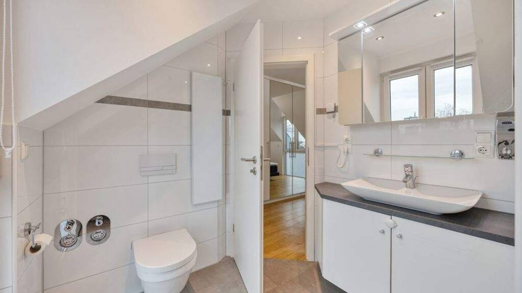 Die Küche sowie beide Bäder sind mit hochwertigen, gräulichen Bodenfliesen ausgestattet. In den Bädern wird dieses Erscheinungsbild durch weiße Wandfliesen und eine elegante graue Bordüre stilvoll ergänzt.