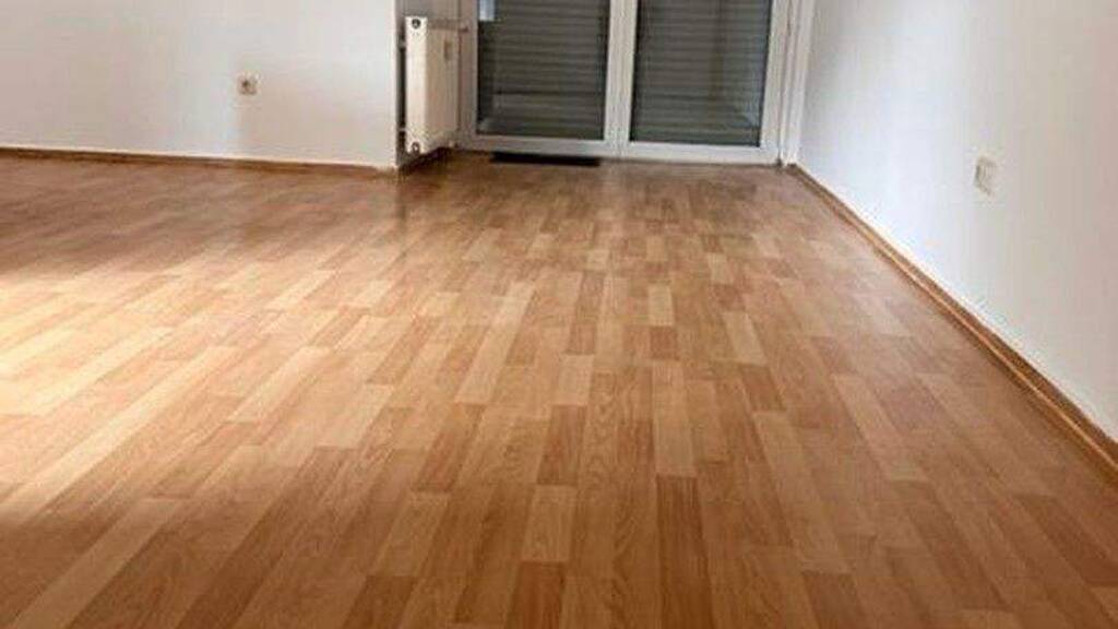 Die Wohnung beeindruckt durch einen offenen Grundriss, der Wohn- und Schlafbereich miteinander verbindet. Der stilvolle graue Laminatboden schafft eine moderne Atmosphäre, während große Fensterflächen für eine lichtdurchflutete Wohnatmosphäre sorgen.