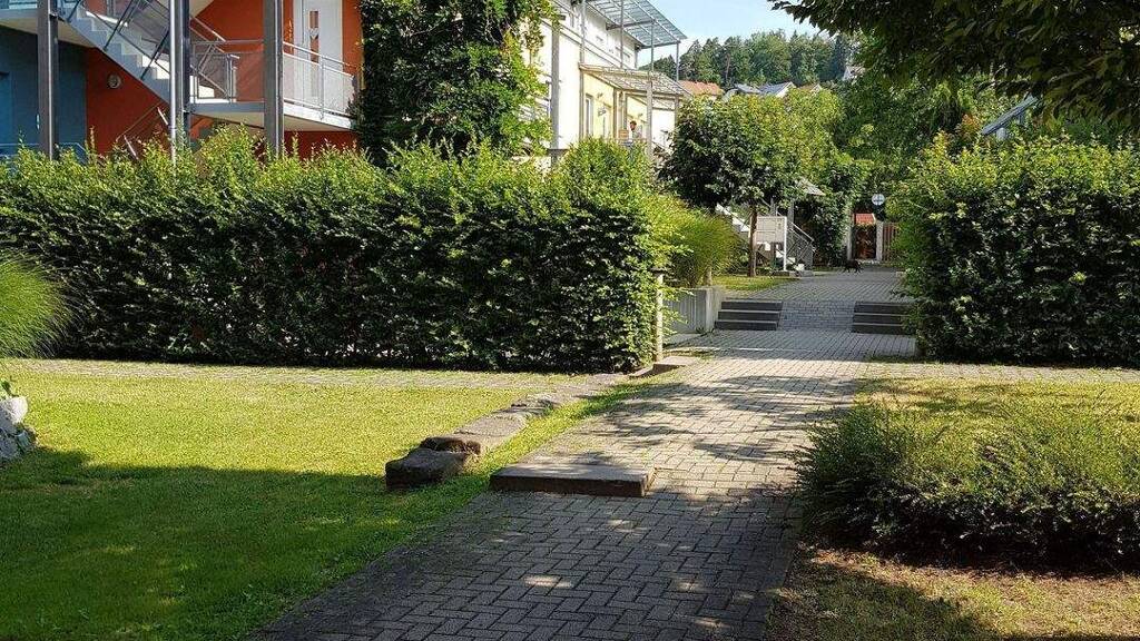 Die gepflegte Außenanlage mit Grünflächen und Bäumen schafft eine ruhige und sonnige Wohnatmosphäre.
