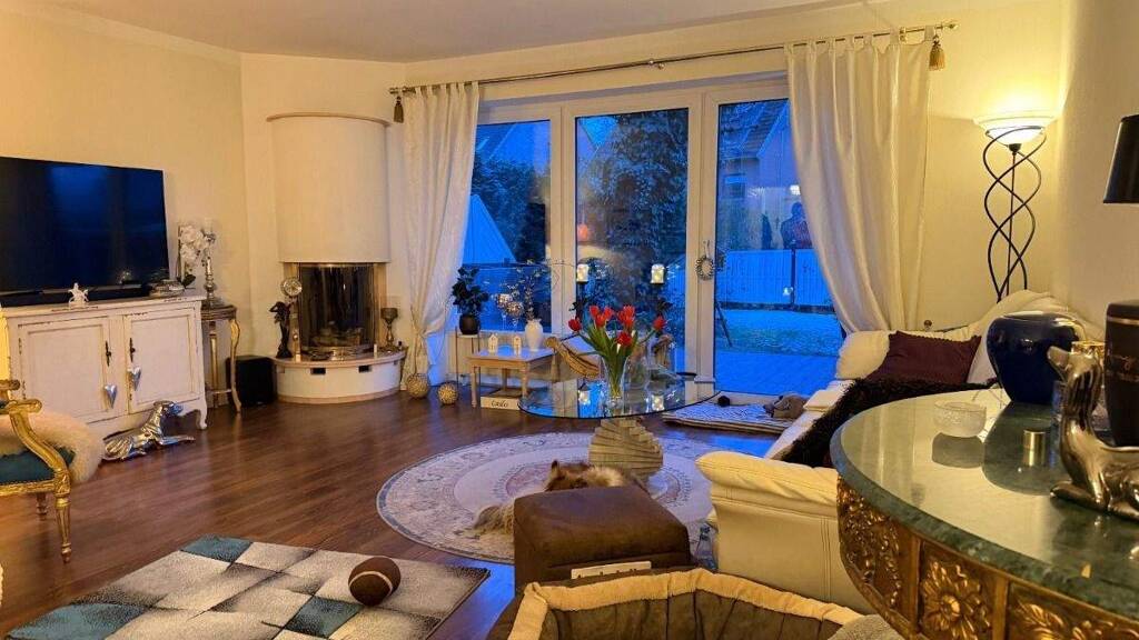 Herzstück des Hauses ist der großzügige Wohn- und Essbereich mit Kamin und direktem Zugang zur Terrasse sowie in den Garten. Große Fensterflächen sorgen für viel Tageslicht und eine angenehme Wohnatmosphäre.