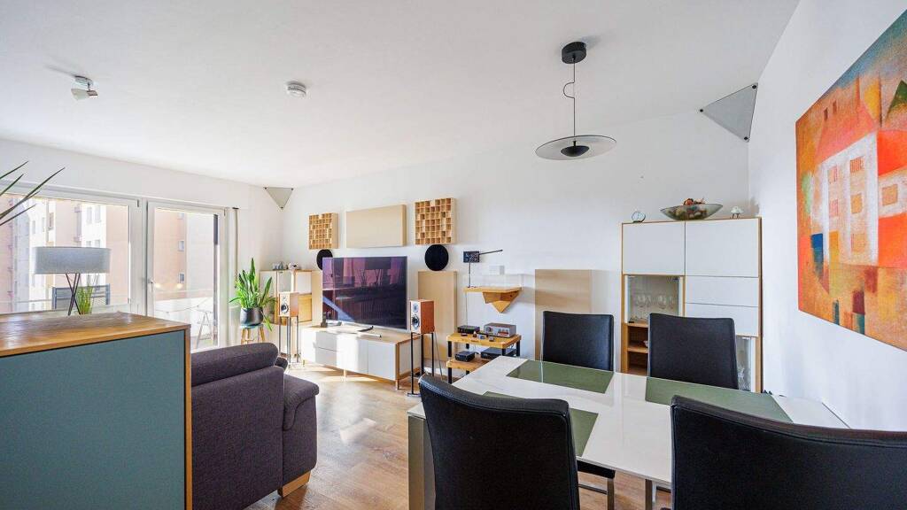HerzstĂĽck der Wohnung ist der lichtdurchflutete Wohn- und Essbereich mit direktem Zugang zum ĂĽberdachten Balkon. Von hier aus genieĂźen Sie einen freien Blick auf die angrenzenden Felder - ein idealer Ort, um den Alltag hinter sich zu lassen und entspannte Stunden im Freien zu verbringen.