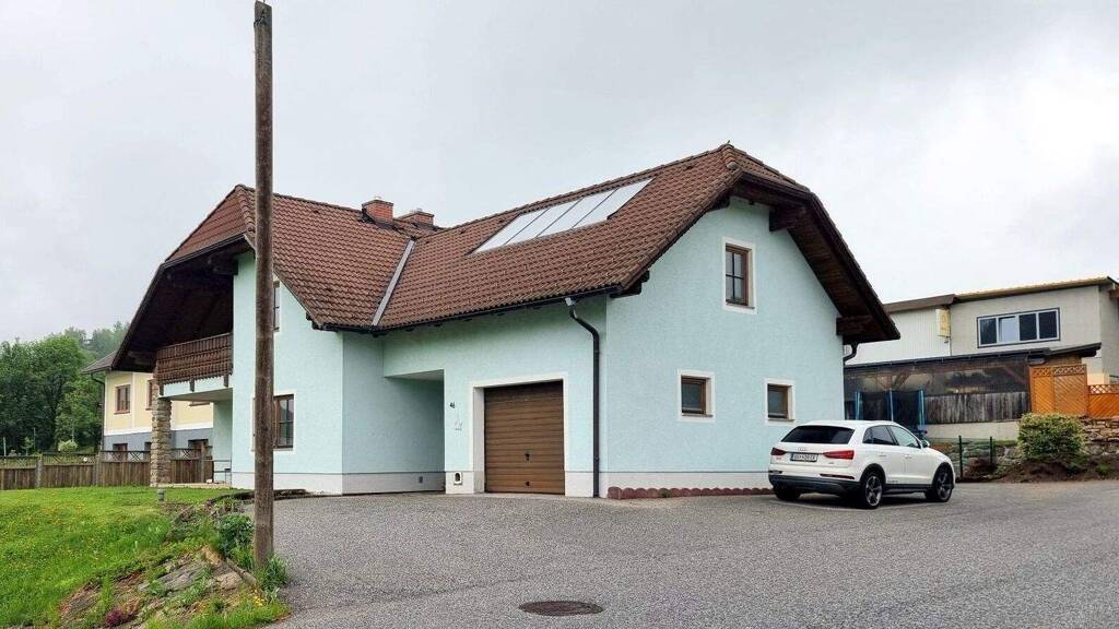 Das Haus ist an Kanal und Ortswasser angeschlossen. Beheizt wird es über eine Öl-Zentralheizung, ergänzt durch Fußbodenheizung im Vorraum und Badezimmer des Erdgeschosses; in den übrigen Räumen sorgen Heizkörper für angenehme Temperaturen. Die Warmwasseraufbereitung wird durch eine Solaranlage unterstützt. Zur Immobilie gehören drei Garagen: eine ins Haus integrierte Garage sowie eine Doppelgarage in einem separaten Gebäude. Der vollunterkellerte Bereich bietet zusätzlichen Stauraum und vielseitige Nutzungsmöglichkeiten.