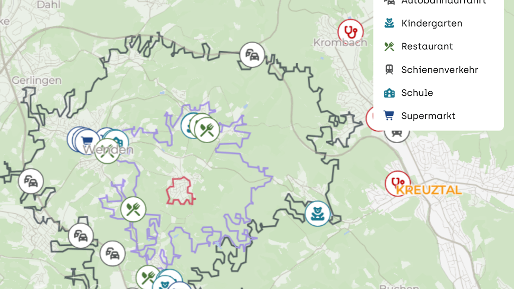 Die Immobilie befindet sich in einer ruhigen und dennoch gut angebundenen Lage in Wenden. Die Umgebung bietet eine Vielzahl an Einkaufsmöglichkeiten, darunter Supermärkte wie HIT, Nahkauf und Penny, die alle in etwa 5 bis 10 Autominuten erreichbar sind. Für die tägliche Fitness ist das Aktiva Premium Fitnessstudio nur eine kurze Fahrt entfernt.