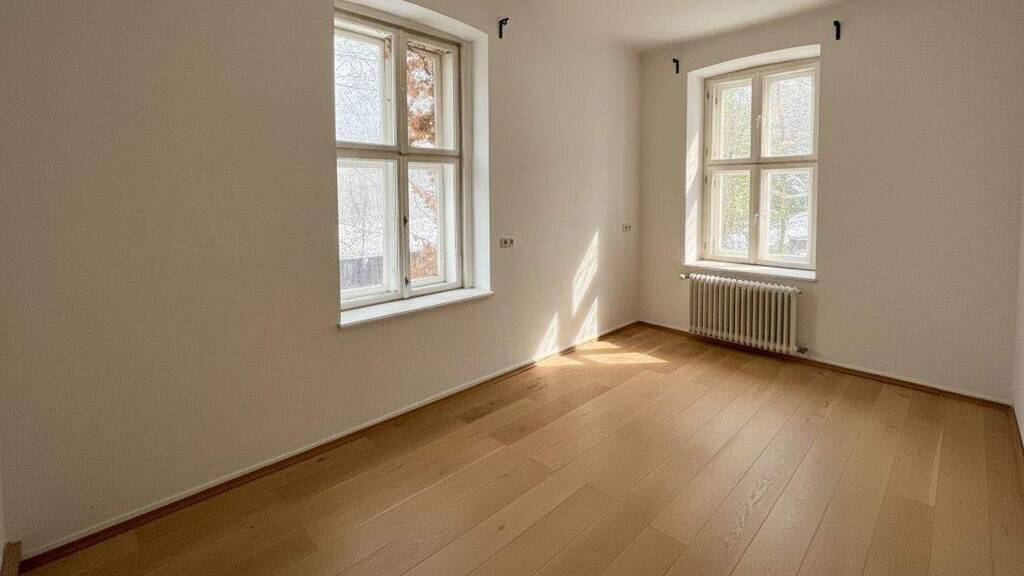 In allen Wohnräumen sind authentische Kiefer-Dielenböden verlegt, Bad, WC, Küche und Loggien sind verfliest. Die Beheizung erfolgt mittels Gas-Etagenheizung über Radiatoren, im Bad gibt es eine Fußbodenheizung, im Wohnzimmer steht ein Kachelofen, für die Warmwasseraufbereitung ist im Bad und im WC jeweils ein Boiler untergebracht.
