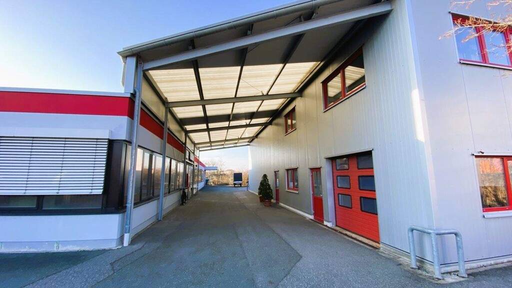Die Gewerbeimmobilie besteht aus zwei separaten Hallengebäuden, die durch eine im Jahr 2008 errichtete Überdachung miteinander verbunden sind. Die Überdachung ermöglicht eine witterungsgeschützte Nutzung des Zwischenbereichs und verbindet die beiden Hallen funktional.