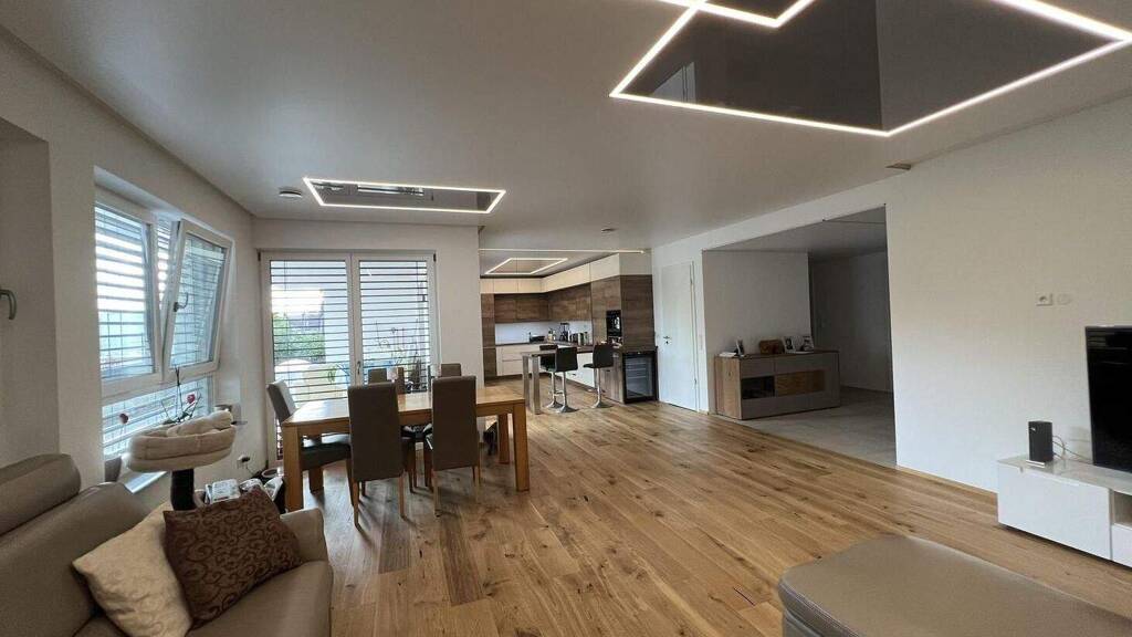 In dieser großzügigen Wohnung hat die ganze Familie Platz um sich zu entfalten. Über die Eingangstür kommen Sie in einen breiten Flur zu den 4 Schlafzimmern. Das separate Gäste-WC mit Dusche ergänzt das große, moderne Hauptbad. Bei mehreren Familienmitgliedern ist ein zweites Bad für alle ein Segen. Der Flur, modern gefliest, geht über in den großen Wohn-/Essbereich mit neuwertiger, wunderschöner Einbauküche mit Theke und hochwertigen Elektrogeräten. Neben der Gefrier-/Kühlkombination gibt es noch einen Kühlschrank für Getränke. Die Kaffeemaschine ist in die Küche integriert - sehr außergewöhnlich und praktisch. Daneben haben Sie einen Hauswirtschaftsraum mit Anschluss für Waschmaschine und Trockner sowie Vorräte oder andere wichtige Dinge für den Haushalt. Hier befindet sich auch die Umluftanlage für Ihre Wohnräume. Vom großen, hellen Wohn-/Essbereich, ausgelegt mit einem hochwertigen Parkettboden, schauen Sie ins "Grüne" oder können von hier aus auf Ihre über 30 qm große Terrasse gelangen. Hier kann man nach der Arbeit entspannen und mit der Familie oder Freunden den Tag ausklingen lassen. Ihre Wohneinheit hat ebenso elegante Spanndecken mit eingelassener, indirekte Beleuchtung (mit funkgesteuerten LED-Leuchten), ein Detail, das dieser Wohnung einen ganz besonderen Flair gibt.