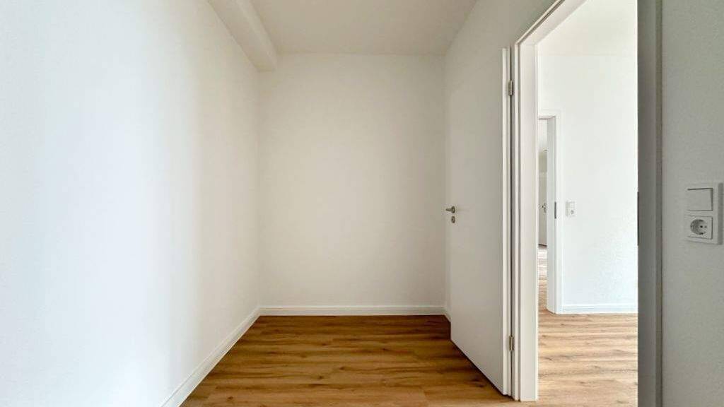 Der Zugang zur Wohnung erfolgt über einen kleinen Zwischenflur, der direkt vom Treppenhaus abgeht und einen angenehm privaten Eingangsbereich bietet. Von hier aus betreten Sie das großzügige, lichtdurchflutete Wohnzimmer - den zentralen Mittelpunkt der Wohnung. Bodentiefe Fenster sorgen für ein beeindruckendes Tageslicht und unterstreichen die offene, luftige Atmosphäre.