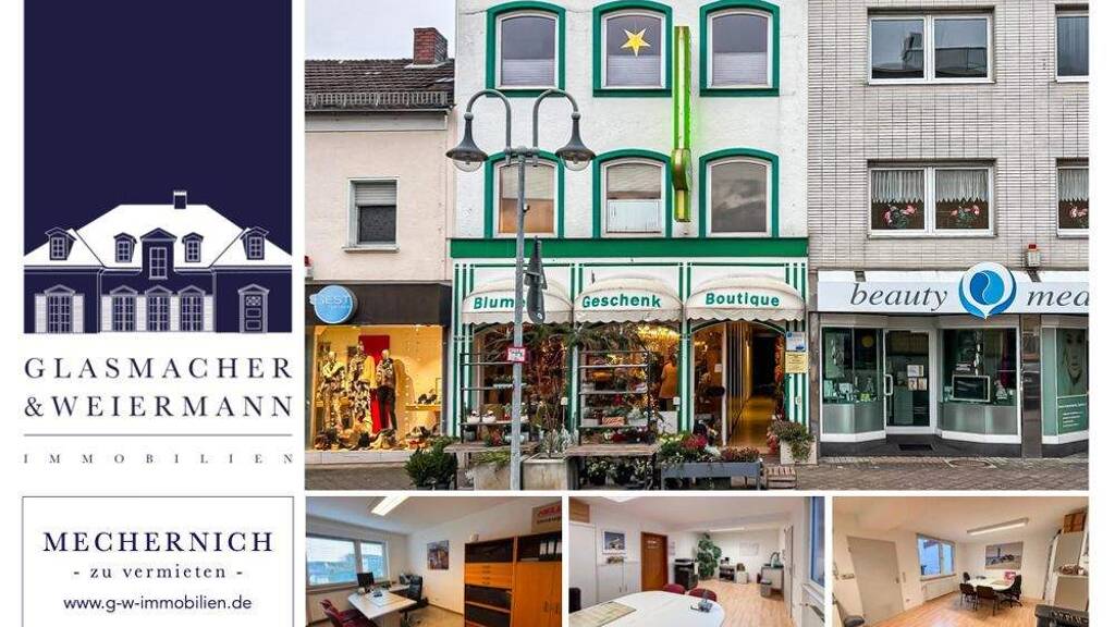 Die zur Vermietung stehende Gewerbefläche befindet sich im 1. Obergeschoss eines gepflegten Mehrfamilienhauses aus dem Baujahr 1977. Das Gebäude ist in Mechernich gut etabliert und beherbergt im Erdgeschoss einen seit vielen Jahrzenten erfolgreichen Blumenladen, was dem Objekt eine solide Frequenz und eine angenehme Gewerbemischung verleiht.