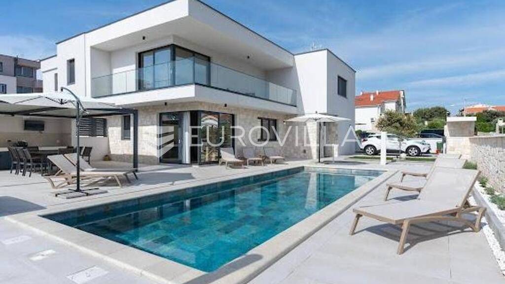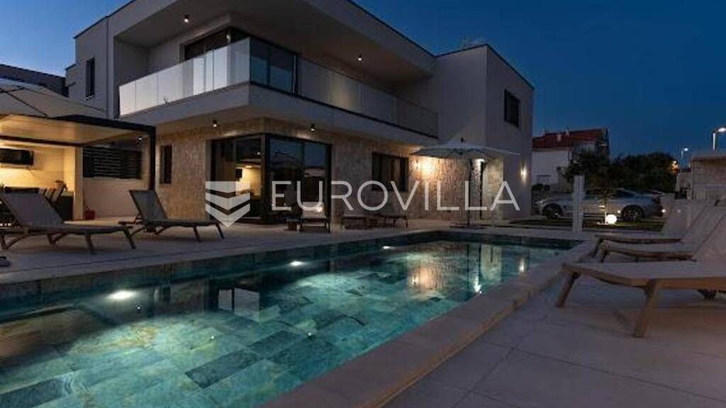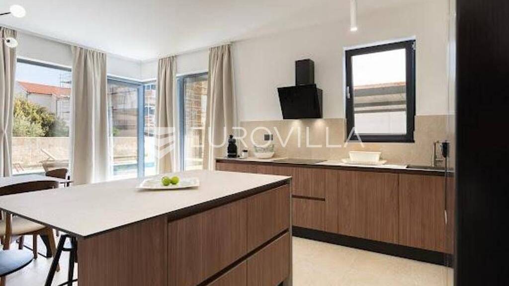 Pag Mandre, dvojna kuca s bazenom nalazi se na zemljistu povrsine 465 m2.Kuca se sastoji od prizemlja i kata, ukupne povrsine 220 m2.U prizemlju se nalazi kuhinja, blagovaonica i dnevni boravak otvorenog koncepta, spavaca soba s kupaonicom, gostinjski wc, veseraj i spremiste.Unutarnjim stepenicama dolazimo na kat gdje se nalazi ulazni prostor, tri spavace sobe s kupaonicama te prostrana terasa.Nalazi se na 350 metara udaljenosti od mora i plaze.Oprema:AB konstrukcijaravni krov sa hidro i termoizolacijomtroslojna antracit stolarija sa broncanim efektomkomarnicivanjska ambijentalna rasvjetabio pergola na daljinsko upravljanjeDaikin dizalica toplinepostavljena priprema za solarne panelevideo nadzorsmart housesolarni tusU dvoristu se nalazi grijani bazen i jacuzzi koji su idealni za opustanje i odmor u prekrasno uredenom okolisu.Osiguran je parking za dva automobila.Ova nekretnina izvrsna je kao kuca za odmor ili investicija za sve one koji se zele baviti turizmom.Vise informacija na upit.... Vise na eurovilla.hr, ID: 648413
