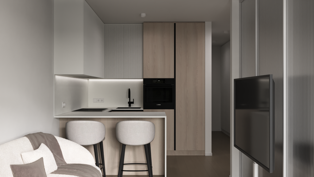 Auf ca. 47?m² Wohnfläche bietet die Wohnung alles, was das Herz begehrt: Das Schlafzimmer ist durch elegante Schiebeelemente vom Wohnbereich getrennt – flexibel und clever gelöst. Bei Bedarf lässt sich der Raum öffnen und als großzügiges Loft genießen oder die Elemente schließen, um sich einen ruhigen Rückzugsort zu schaffen.
