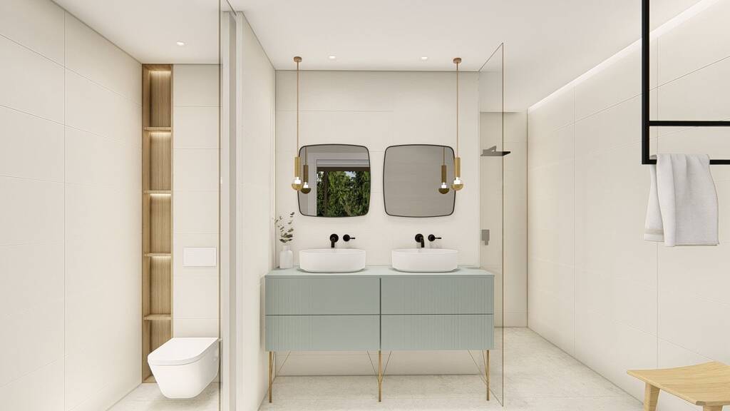 Das erste Villenmodell hat Zugang zu den anderen Schlafzimmern im Untergeschoss, wo sich eine Waschküche, das Hauptschlafzimmer mit eigenem Bad mit Badewanne und ein weiteres Doppelschlafzimmer mit eigenem Bad befinden. Beide Schlafzimmer haben Terrassentüren, die Zugang zu einer Terrasse und dem Garten bieten. Das zweite Villenmodell hat eine ähnliche Aufteilung, aber im ersten Stock mit Sonnenterrassen, die entweder vom Flur im ersten Stock oder vom Hauptschlafzimmer aus zugänglich sind. Bei dieser Villa gibt es auch ein Untergeschoss, in dem sich die Waschküche befindet und die Möglichkeit besteht, zwei weitere Doppelschlafzimmer und zwei Bäder hinzuzufügen, wodurch die Villa zu einem Haus mit fünf Schlafzimmern wird. Beide Villenoptionen verfügen über eine private Garage für mehrere Autos, die auch vom Inneren der Immobilie aus zugänglich ist.