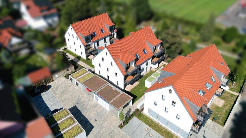 Die BWG-Wohnbau GmbH realisierte eine Wohnanlage aus drei Mehrfamilienhäusern mit klarer Formgebung und Satteldächern in Ziegeleindeckung, passgenau ins Umfeld. Im Erdgeschoss des Gebäudes Friedhofstraße 3 befindet sich eine Praxisfläche und der Ortskern ist fußläufig erreichbar.