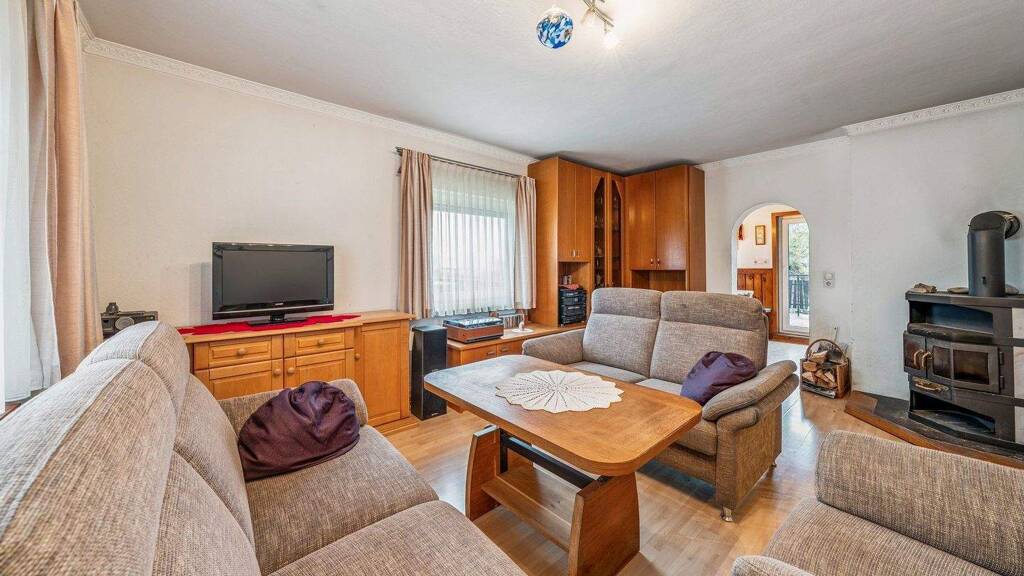 Im Obergeschoss befindet sich ein großer Wohnbereich mit Zugang zum ca. 16,80 m² großen Balkon. Der ausgebaute Keller ergänzt das Raumangebot und eröffnet weitere Wohn- oder Arbeitsflächen. Beheizt wird die Immobilie mittels Holzofen, während zwei Garagenplätze komfortables Parken direkt am Haus ermöglichen.